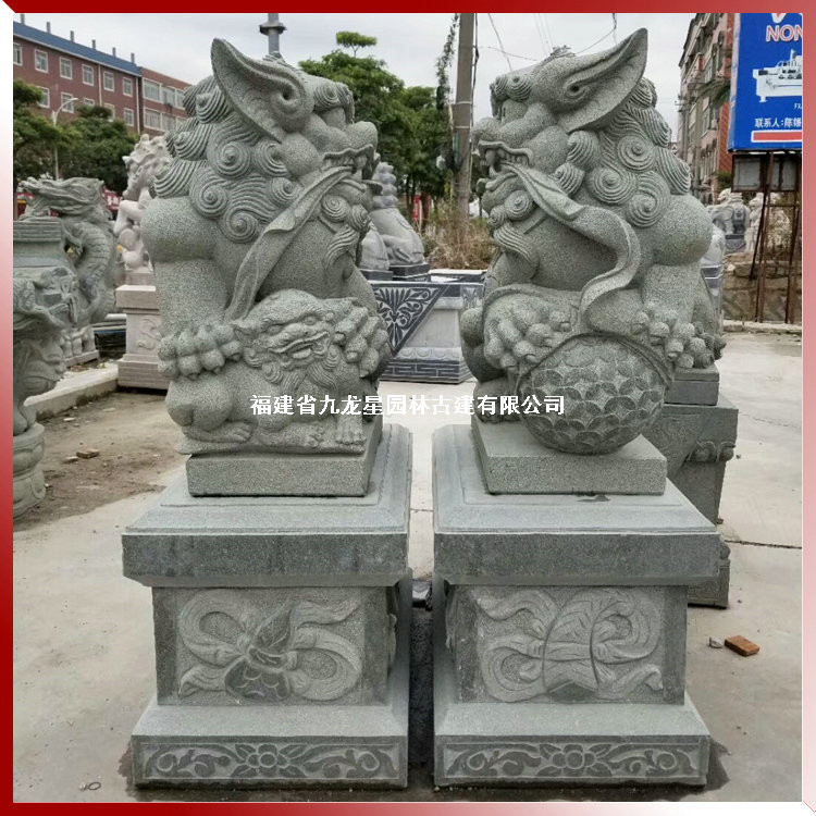 南派石獅子雕刻豐富,多彩有別,獻(xiàn)錢獅則是南派石獅子造型代表之一,因其以飾一串古錢而得名。因此,獻(xiàn)錢獅有著招**進(jìn)寶的寓意,因?yàn)樵煨秃B(tài)可掬,少了幾分獅子的威嚴(yán),多了幾分靈性,雄獅常飾于大串的銅錢,寓意招**進(jìn)寶。而雌獅則戲玩著小獅子,寓意人丁興旺之意,同樣也是人們熱衷于選擇的造型之一。獻(xiàn)錢獅是中國石雕獅子造型中常見的一種,同樣常見的還有北方傳統(tǒng)的京獅石雕獅子。