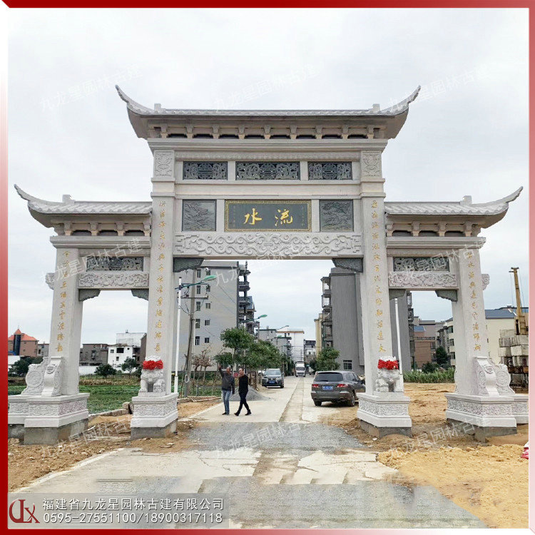 石雕三門牌坊,三門三樓石雕牌坊在雕刻藝術上也獨具特色,通常中門以深浮雕、透雕為主,邊門雕刻的是淺浮雕吉祥花鳥,形成呼應、疏密、節奏感和韻律。有的則雕刻祥龍騰云駕霧浮雕,雕刻這種浮雕圖案的石牌坊可以帶來吉祥好運,村莊安裝這樣的一座三門三樓石牌坊可以化解當地各種不好的風水煞,這種村莊石雕牌坊可以改善村莊運氣,使村莊紅紅火火,人財兩旺。