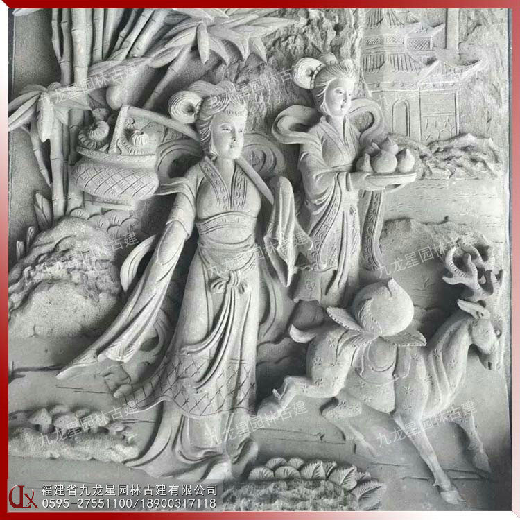 九龍星園林古建浮雕題材:生活風俗、神話故事,諸如吉慶有余、五谷豐登、龍鳳呈祥、平安如意、八仙祝壽、松鶴延年 、太平有象、鹿竹同春、五福臨門、喜鵲登梅、丹鳳朝陽等適用于寺廟浮雕、祠堂浮雕、建筑迎門墻、景區戶外大型建筑外墻石材浮雕。