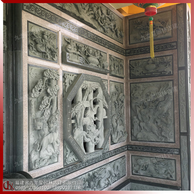 石雕浮雕壁畫在古建筑外墻中占據(jù)重要的地位。古建筑的石雕浮雕在內(nèi)容、形式和材質(zhì)上與圓雕一樣豐富多彩。建筑石雕浮雕常見的材料有青石、花崗巖、白麻、芝麻黑、羅源青、古田青等等。浮雕的雕刻技藝和表現(xiàn)體裁與圓雕基本相同。